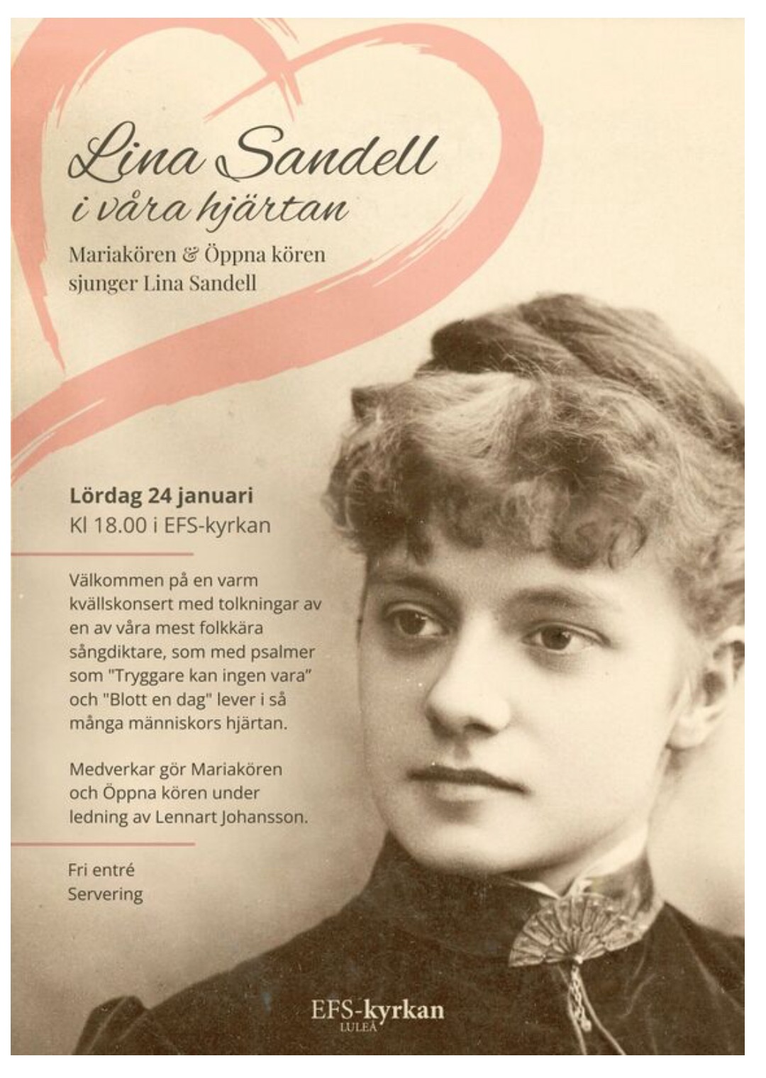 - Konsert med Lina Sandells vackra sånger i EFS-kyrka på lördag 24 januari kl 18. Hjärtligt välkomna!
